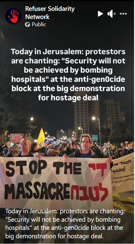 - Soutenir MAINTENANT les protestataires, déserteurs, refuzniks, objecteurs et démocrates israéliens, parents des otages, pour que Netanyahou soit renversé et jugé !