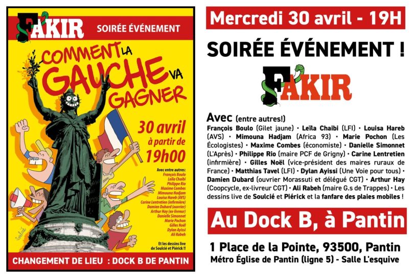 C’est pour répondre à cette lancinante question, y compris par l’affirmative, que le journal Fakir, fondé par François Ruffin, journaliste et réalisateur bien connu devenu depuis député, a tenu, le 30 avril dernier, une soirée. Prévu initialement à la Bourse du travail de Paris, sa délocalisation à la dernière minute de l’événement aux docks de Pantin n’aura pas compromis son succès avec près de trois cent participant-es.