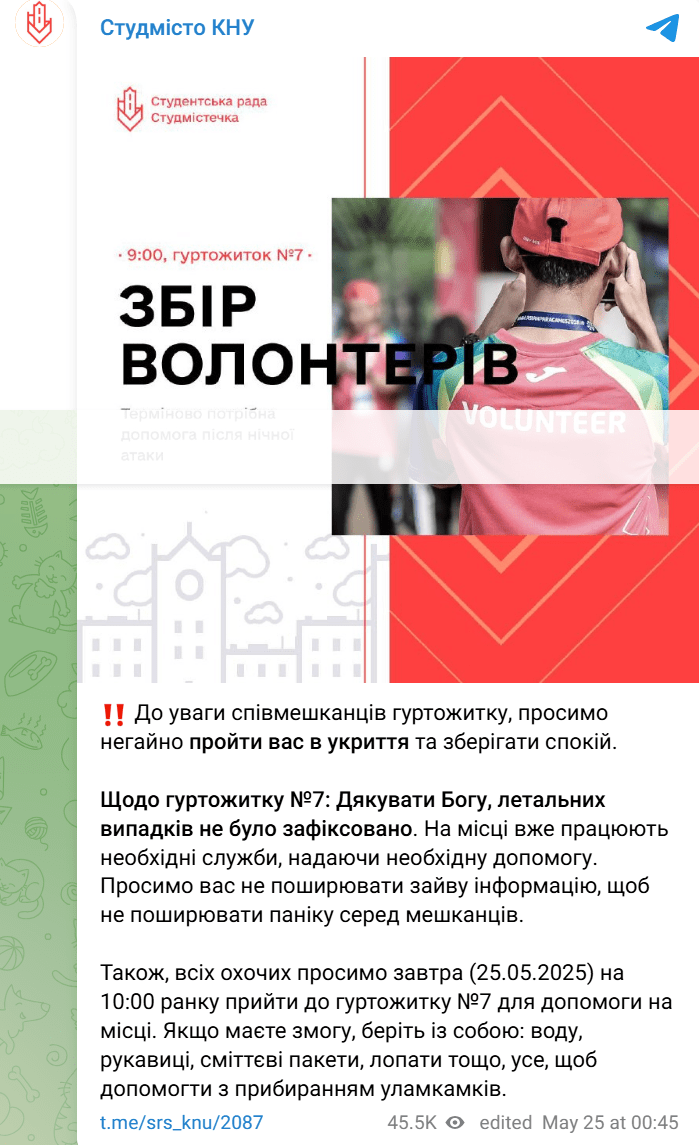 Cette nuit, suite aux bombardements russes, les dortoirs du Taras Shevchenko studmistečka de l’Université nationale de Kiev ont été endommagés. Heureusement pas de victimes mais il y a des victimes ailleurs dans Kyiv.