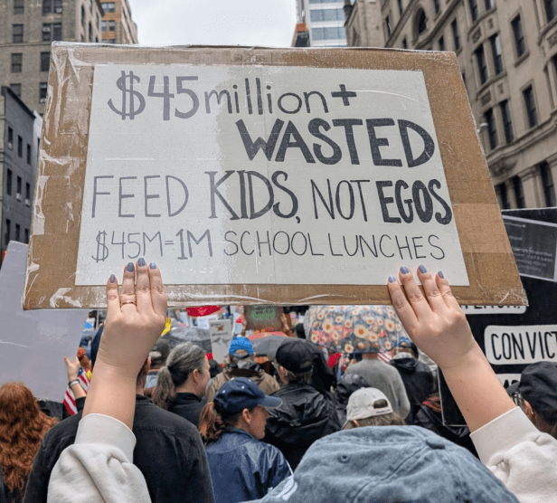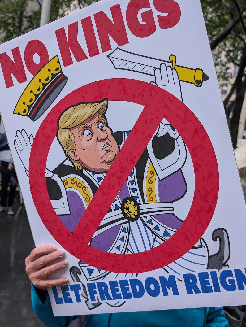 Au moins cinq millions de personnes ont participé aux 2 000 manifestations « No Kings Day » dans les grandes et petites villes des 50 États, la plus importante d’une série de manifestations nationales à ce jour. Dans un esprit festif mais provocateur, accompagnés de fanfares et de percussionnistes, les manifestants ont scandé des slogans, chanté des chansons et brandi des pancartes avec des slogans comme « No Kings since 1776 » [Pas de rois depuis 1776, date de la déclaration d’indépendance vis à vis du roi d’Angleterre] ou des pancartes s’opposant aux attaques du président Donald Trump contre la santé, les programmes alimentaires pour les enfants et les personnes âgées, ou encore contre l’éducation et la science.