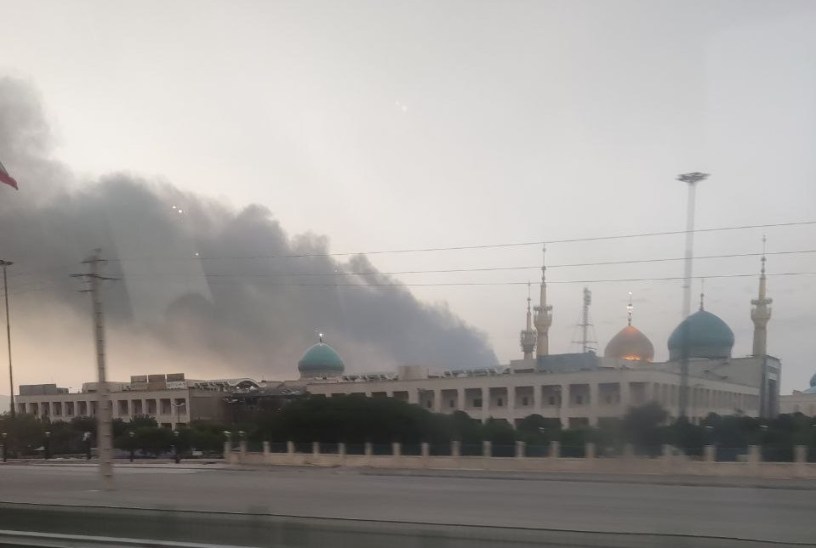 Photo illustrant cet article : fumée des bombardements derrière le mausolée de Khomeiny.