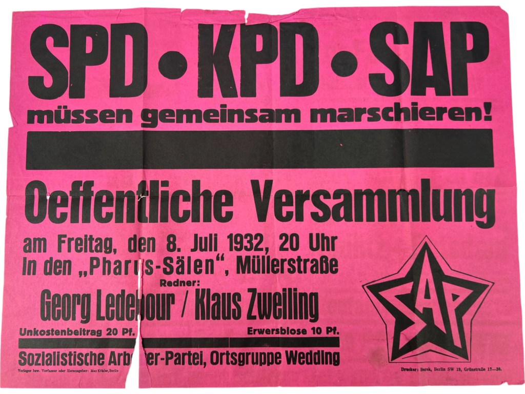 Fin 1931 se produit pourtant un événement politique lourd de signification sinon de conséquences : l’exclusion et l’organisation en parti indépendant de la gauche social-démocrate. Les réseaux mis en place par Paul Lévi, renforcés courant 1930 du SO des Jeunesses qui condamne le soutien apporté à Brüning au nom du « moindre mal », plus 6 députés et une équipe de réformistes sincères, Max Seydewitz, Kurt Rosenfeld, Erich Ziegler, renforcés de la pédagogue pacifiste Anna Siemsen et de l’économiste marxiste Fritz Sternberg, rejoints lors de leur exclusion par l’USPD maintenue, de longue date marginale mais dotée d’un vétéran prestigieux, Georg Ledebour : telles sont les composantes qui, le 4 octobre 1931, forment le SAP, Parti Socialiste Ouvrier, qui se prononce, comme Trotsky vient de le faire dans d’importants articles consécutifs au plébiscite prussien, pour le front unique immédiat contre les nazis.
