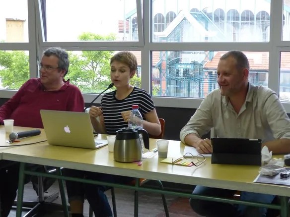 Son texte est ici traduit de l’anglais. La photo illustrant cet article date de 2018, lors de la seconde visite d’Hanna dans l’Allier : Vincent Présumey, Hanna, Sylvain Bourdier élu depuis maire de Commentry – Alexis Mayet était également à cette tribune.