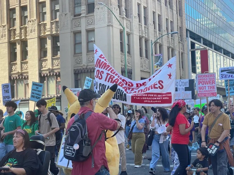 J’ai assisté à deux rassemblements syndicaux le jour de la Fête du Travail, à San Francisco et à Oakland. Je l’ai fait en partie pour distribuer le tract que j’avais imprimé et pour porter cette affiche. Mais j’étais aussi curieux de voir ce qui allait en être dit. Comme d’habitude, je n’ai pas écouté tous les discours, qui n’étaient qu’un ramassis de blabla sur la façon dont les syndicats allaient se battre, des dénonciations des « milliardaires », la façon dont nous allions soutenir nos frères et sœurs immigrés, etc. J’ai donc peut-être raté quelque chose, mais d’après ce que j’ai entendu, il n’y a eu aucun commentaire sur l’envoi de troupes par Trump dans les rues américaines. J’ai regardé autour de moi les différentes pancartes imprimées, et aucune n’en parlait non plus. J’avoue qu’il y avait une possibilité très effrayante, comme « Dites-le une fois. Dites-le deux fois. Nous n’avons pas peur de l’ICE. » Je suis sûr que tout cela va vraiment intimider Trump.