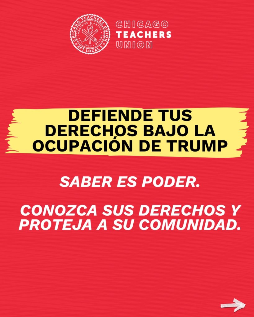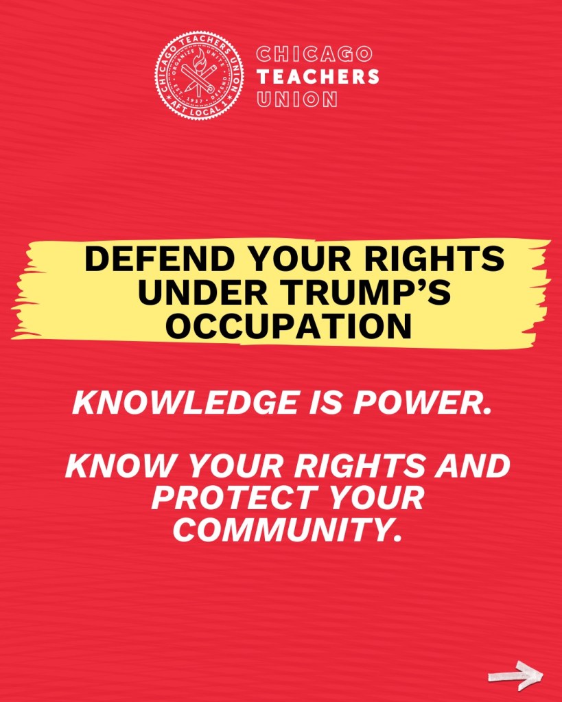 Le Chicago Teachers Union appelle à la mobilisation, sans toutefois envisager l’organisation de l’autodéfense physique pour interdire à l’ICE et éventuellement à la Garde nationale et à l’armée l’entrée dans la ville et les quartiers, cela bien lorsqu’il parle de résistance à l’occupation annoncée :