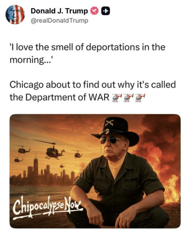 La bataille de Chicago a été annoncée par un incroyable tweet de Trump, pas du tout un fake, datant du 7 septembre au matin. Entre janvier 2025 et maintenant l’affrontement, démocratique et donc social, n’a cessé de grandir aux Etats-Unis. L’ICE a massivement recruté des nervis : l’équivalent des milices fascistes s’y concentre. Le langage et les objectifs du pouvoir sont clairement la guerre : la guerre, la Civil War, aux Etats-Unis, contre les pouvoirs locaux et contre la démocratie. Et il fait référence au ministère des Armées, confié au taré masculiniste Egseth, qu’il vient précisément de rebaptiser ministère de la Guerre. Voici le tweet de Trump :