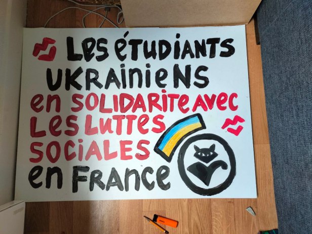Ce matin, la camarade Varvara de Priama Diia m’a fait parvenir cette déclaration : « nous avons écrit une lettre pour soutenir votre résistance ». Cette déclaration a été écrite en français et montre une connaissance fine des conséquences de la politique austéritaire en France. Elle articule les fronts de lutte à l’échelle mondiale : « Nous sommes avec vous, car cette lutte n’est pas seulement française, elle est universelle. »