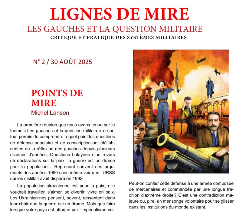 Des publications d’articles, de documents sont regroupés dans ce cahier « Lignes de mire 1 ». Des contacts avec des spécialistes de différentes questions (armement, économie, sociologie…) des analystes militaires (Ukraine, Russie, Finlande…) sont ou seront contactés afin d’organiser des réunions thématiques. Nous avons tou·tes le même objectif : animer une réflexion commune utile à tou·tes pour qu’enfin la gauche crée un corpus théorique commun qui lui permettra de sortir de l’impasse pacifiste a priori ou d’arrêter d’abandonner ces questions aux gouvernements bourgeois. Il est évidemment toujours possible de s’inscrire dans le groupe, de participer à la réflexion commune.