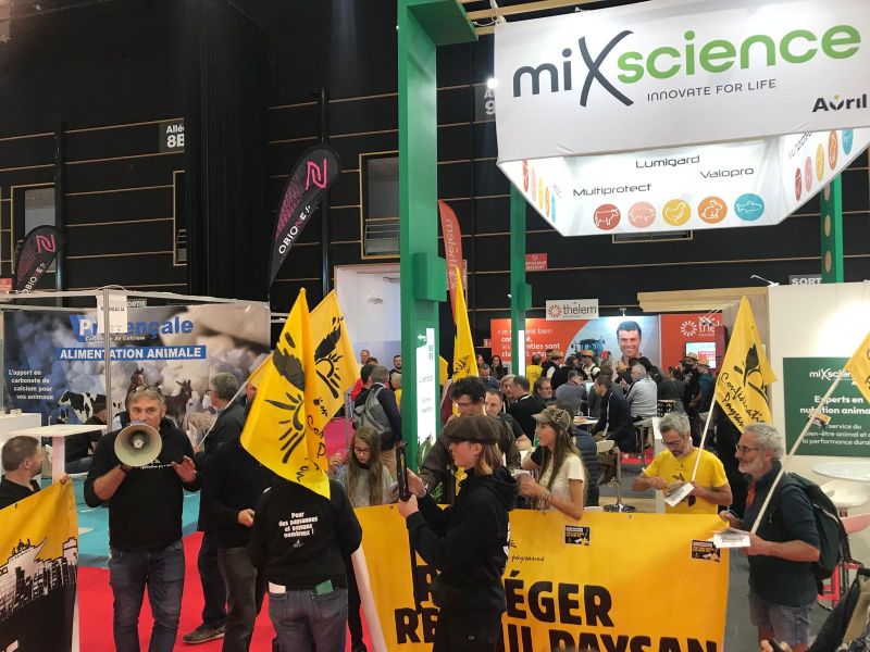 En plus du stand du Ministère de l’Agriculture visité lors de la déambulation, le stand de la filiale d’Avril, MixScience, a été confronté par la trentaine de manifestant·es à leur politique d’acquisition d’usines d’alimentation animale au Brésil. Cette multinationale Avril, dirigée par Arnaud Rousseau, est le symbole des contradictions des dirigeants de la FNSEA* et de l’agrobusiness, qui fragilise le front commun contre les accords de libre-échange. Nous avons distribué largement nos tracts dans les allées du Sommet et appelé à rejoindre notre mobilisation du 14 octobre à Paris, esplanade des Invalides, contre tous les accords de libre-échange.