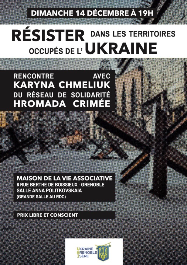 Du 9 au 17 décembre, Karyna Chmelyuk, exilée de Crimée depuis 2023 et militante anti-autoritaire du réseau de solidarité Hromada Crimea se rendra dans plusieurs villes de l’Hexagone pour rendre compte des conditions de vie sous occupation russe et des modes d’organisation, décentralisée, de la résistance. A l’occasion de cette rencontre, nous projetterons un documentaire (ukrainien, sous-titré en français) sur un autre mouvement de résistance, Zla Mavka, sous la forme d’une interview de ses fondatrices.