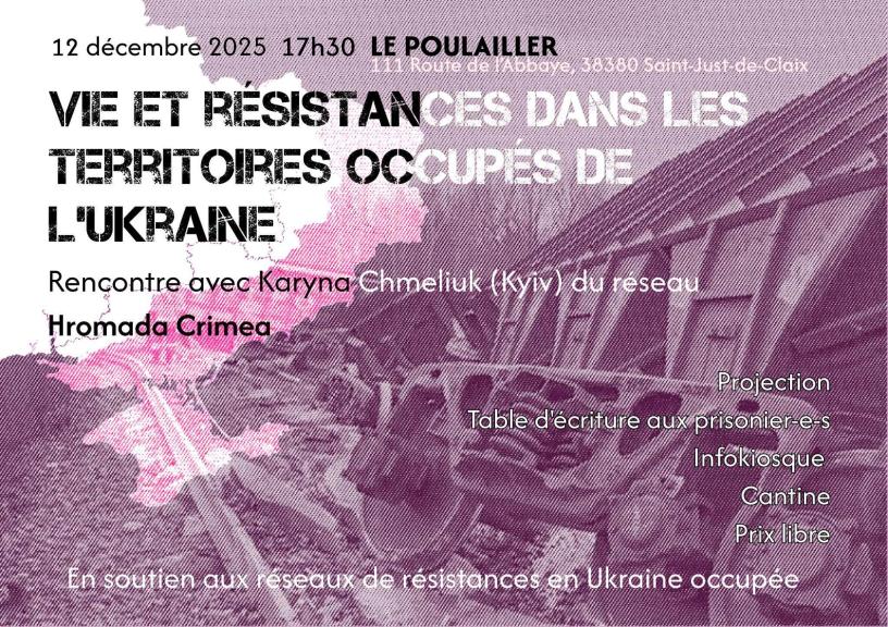 Du 9 au 17 décembre, Karyna Chmelyuk, exilée de Crimée depuis 2023 et militante anti-autoritaire du réseau de solidarité Hromada Crimea se rendra dans plusieurs villes de l’Hexagone pour rendre compte des conditions de vie sous occupation russe et des modes d’organisation, décentralisée, de la résistance. A l’occasion de cette rencontre, nous projetterons un documentaire (ukrainien, sous-titré en français) sur un autre mouvement de résistance, Zla Mavka, sous la forme d’une interview de ses fondatrices.