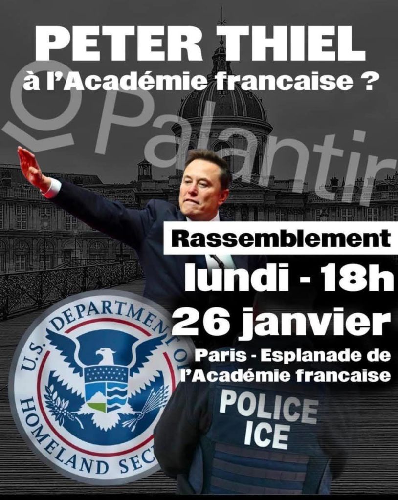 Le milliardaire fou Peter Thiel, inventeur de J.D.Vance, agent de contact entre Trump et Musk, promoteur et coach des nazis et fascistes 2.0 Yarvin et Lang, qui interdit les syndicats et les grèves dans la Silicon Valley, dont la firme Palantir équipe en logiciels de surveillance et de traque ICE et l’armée israélienne et vient de contracter avec la DGSE, qui fournit les livres de chevet de Pierre-Edouard Stérin, qui dit préparer l’Apocalypse pour l’avènement du capital, dont l’humanité d’après son écolâtre Dick Land n’est que l’hôte passager, et qui inspire l’alliance des cathos tradis et des néos nazis, est à Paris demain, pour parler à la prétendue Académie des Sciences morales et politiques, qui vient d’introniser l’affairiste Bernard Arnault. ll est invité par Jean-David Lévitte, ancien ambassadeur sarkozyste aux Etats-Unis.