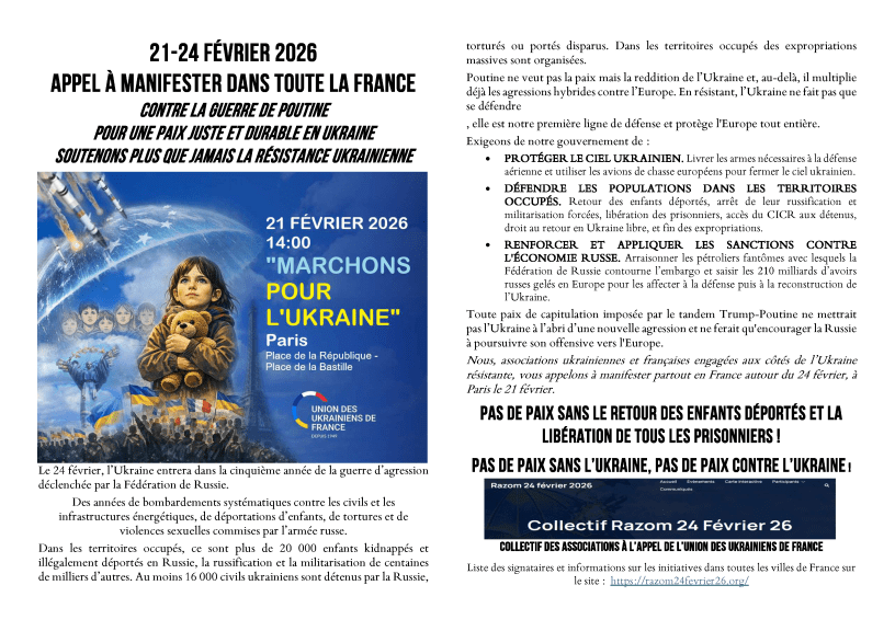 Nous, associations ukrainiennes et françaises engagées aux côtés de l’Ukraine résistante, vous appelons à manifester partout en France autour du 24 février, à Paris le 21 février.
