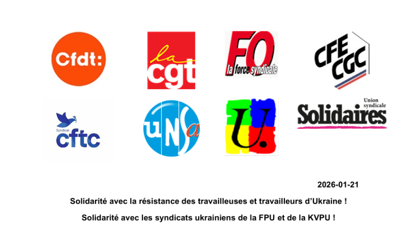 La CFDT, la CGT, FO, la CFE-CGC, la CFTC, l’UNSA, Solidaires et la FSU réaffirment leur solidarité pleine et entière avec les travailleuses et travailleurs d’Ukraine, ainsi qu’avec nos organisations sœurs de la FPU et de la KVPU, qui poursuivent sans relâche la défense des droits sociaux, de la démocratie et des libertés syndicales dans des conditions d’une violence et d’une adversité extrêmes.