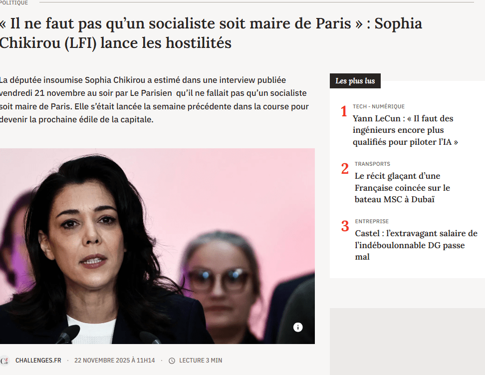 La même Sophia Chikirou, comme candidate à la mairie de Paris, est, de tous les candidats municipaux notoires de LFI, la plus engagée dans une ligne de division ouvrant la voie à l’union des droites, son objectif premier avoué étant de faire perdre la mairie de Paris au PS pour la rendre à la droite, donc à l’union des droites.