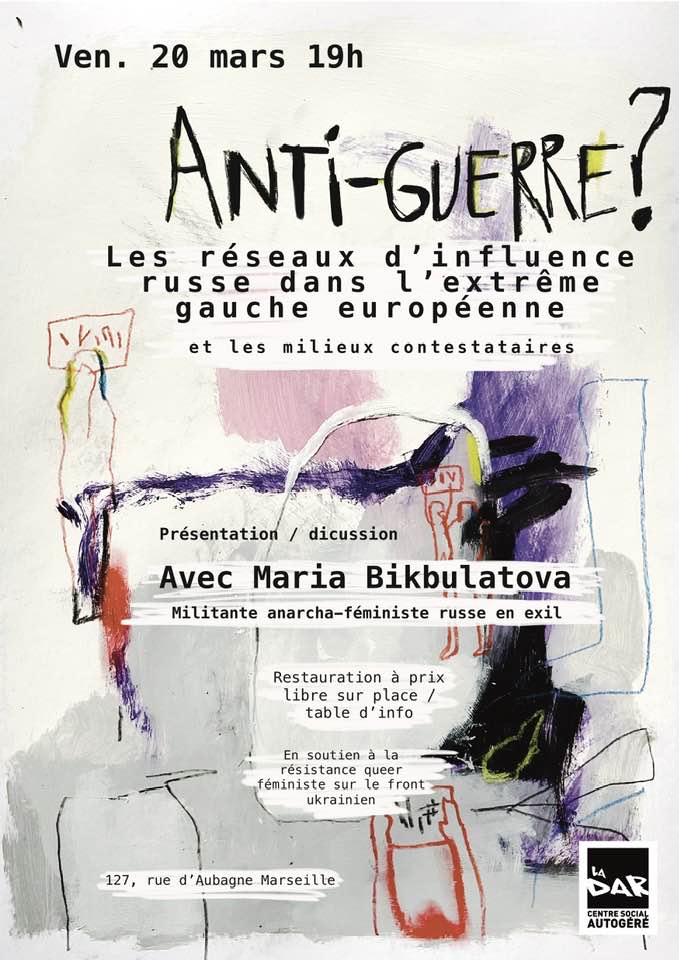 Maria Bikbulatova, anarcho-communiste et féministe russe émigrée, dont nous avons publié un important article sur les réseaux policiers russes et « masculinistes » si proches, si proches, de groupes émigrés eux-mêmes parrainés par LFI et le POI notamment, fera une conférence sur ces sujets à Marseille le 20 mars prochain. En voici la présentation :