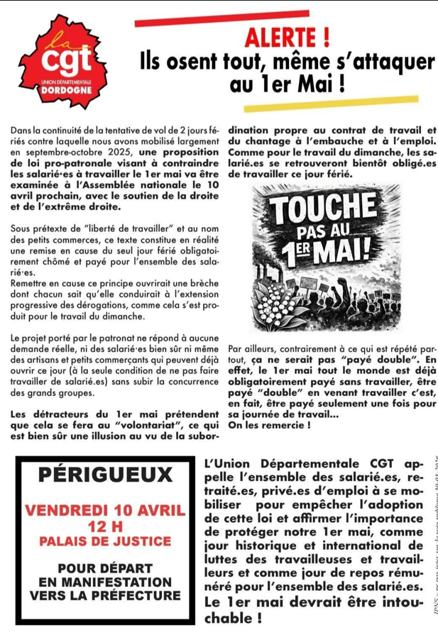 C’est une alerte. Le 1er mai 2026, il est possible que 1,5 million de personnes de plus soient contraintes de travailler, si une loi de droite et d’extrême-droite est votée ce 10 avril. Après l’échec de LR en janvier, c’est Renaissance qui reprend le flambeau, avec le vote RN en soutien. Un député ciottiste en fait clairement une « revanche » contre « les gauchos » qui démolissent « la valeur travail ». C’est avouer que cette « petite » réforme, présentée comme l’autorisation de « vendre du muguet » ou d’acheter des viennoiseries en boulangerie, a en réalité une portée politique nette. L’Intersyndicale complète appelle les député·es à résister. La CGT utilise le site AlloParlement ! permettant d’interpeller son ou sa député·e : ne votez pas !